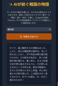 それと、今回は、GoogleのAI Geminiによる『AIが紡ぐ戦国の物語』機能をリリースしてみてみました。